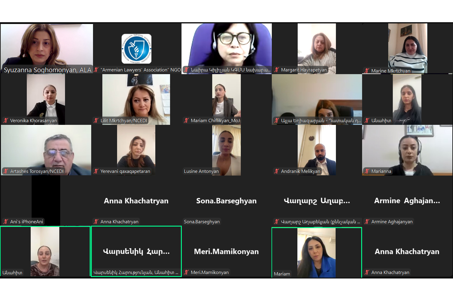 2025 թվականի ապրիլի 16-ին, «Իրավաբանների հայկական ասոցիացիա» հասարակական կազմակերպության և Արցախից բռնի տեղահանվածների իրավունքների պաշտպանության ՔՀԿ-ների ցանցի նախաձեռնությամբ կայացել են առցանց ֆոկուս խմբային քննարկումներ՝ Հայաստանի Հանրապետության մարդու իրավունքների պաշտպանության ազգային ռազմավարության և դրա իրականացման 2023-2025 թվականների միջոցառումների ծրագրի 2023-2024 թվականների կատարման գործընթացի հասարակական մշտադիտարկման շրջանակում։