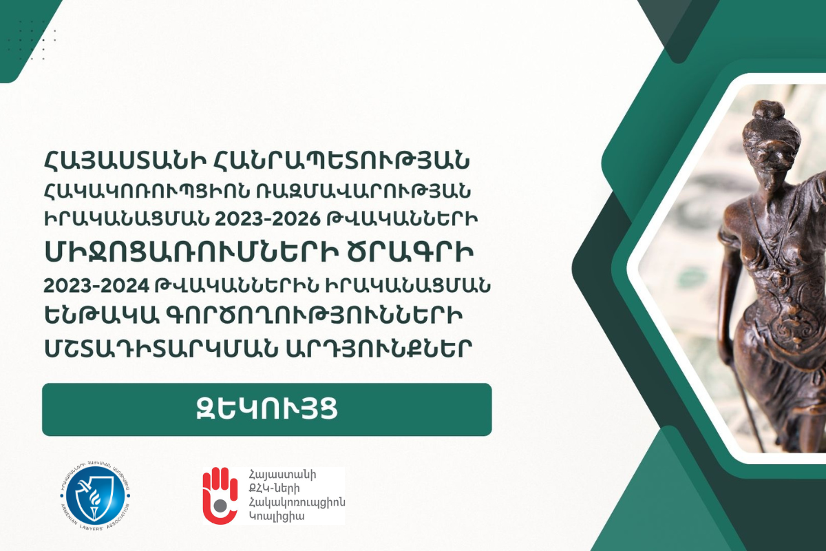 «Իրավաբանների հայկական ասոցիացիա» ՀԿ-ը (ԻՀԱ)՝ Հայաստանի ՔՀԿ-ների հակակոռուպցիոն կոալիցիայի հետ համագործակցությամբ իրականացրել է Հայաստանի Հանրապետության հակակոռուպցիոն ռազմավարության և դրա իրականացման 2023-2026 թվականների միջոցառումների ծրագրի 2023-2024 թվականների տարեկան կատարման հասարակական մշտադիտարկում: